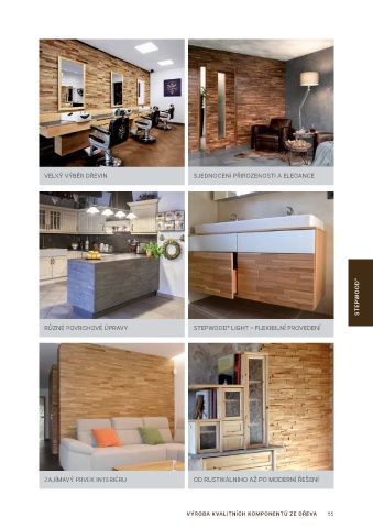 VELKÝ VÝBĚR DŘEVIN SJEDNOCENÍ PŘIROZENOSTI A ELEGANCE STEPwOOD ® RŮZNÉ POVRCHOVÉ ÚPRAVY STEPWOOD LIGHT – FLEXIBILNÍ PROVEDENÍ ® ZAJÍMAVÝ PRVEK INTERIÉRU OD RUSTIKÁLNÍHO AŽ PO MODERNÍ ŘEŠENÍ VÝROBA KVALITNÍCH KOMPONENTŮ ZE DŘEVA 55
